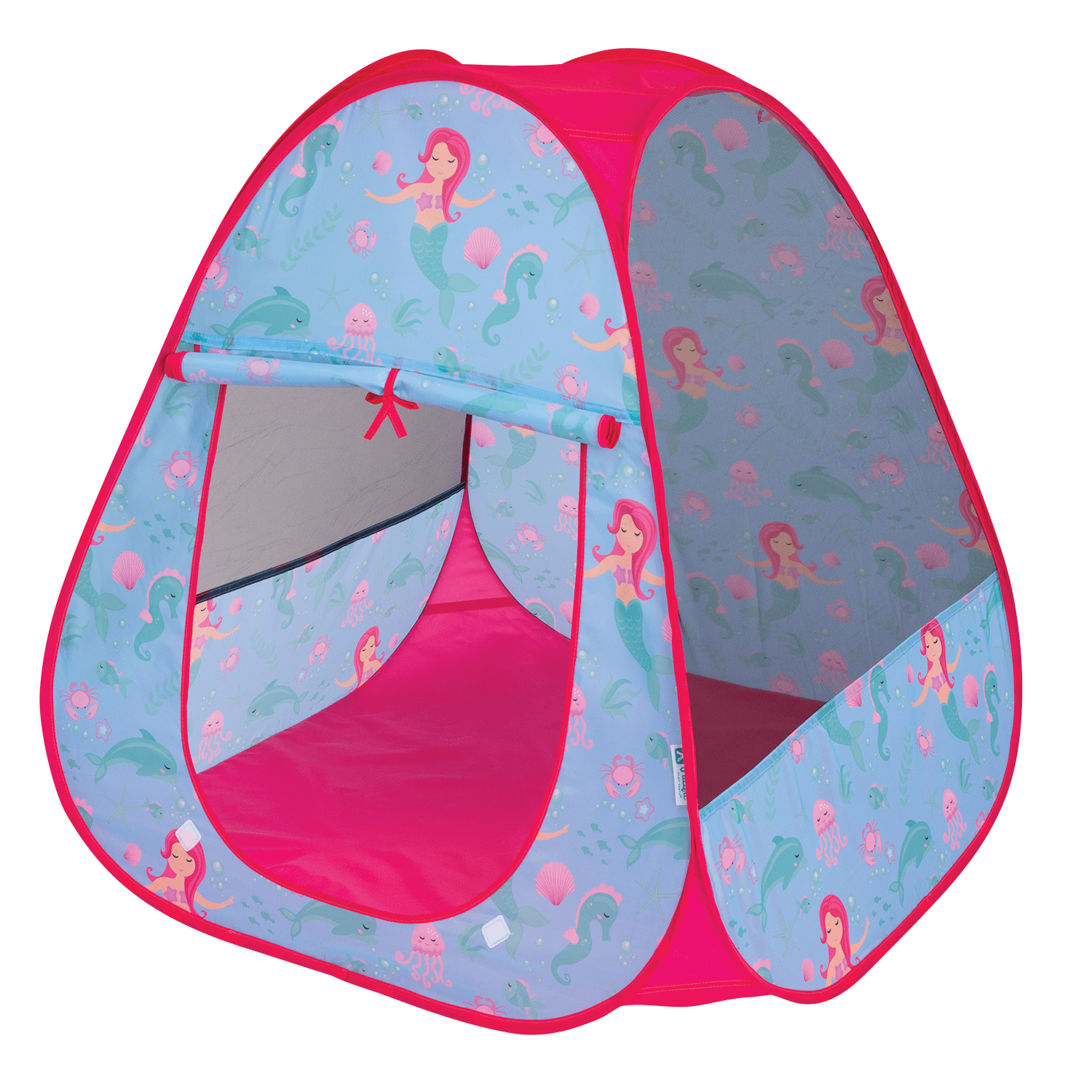 Dive into a world of imagination with the Pacific Play Tents® Mermaid and Friends Pop-Up Tent! Designed to spark creativity and undersea adventures, this charming tent pops open in seconds, providing instant fun for playrooms, living rooms, or the backyard. Made with durable materials ideal for indoor and outdoor use, it features mesh roof panels that keep fresh air flowing while allowing adults to easily keep an eye on playtime. The roll-up door, secured with hook-and-loop tabs, offers convenient entry, exit, and ventilation for your little explorers. When playtime is over, the tent folds down quickly and slips into the included zippered carry bag for effortless storage and travel. Lightweight, portable, and beautifully decorated with friendly mermaid characters, it’s the perfect cozy hideaway for little fans of magical underwater worlds.
